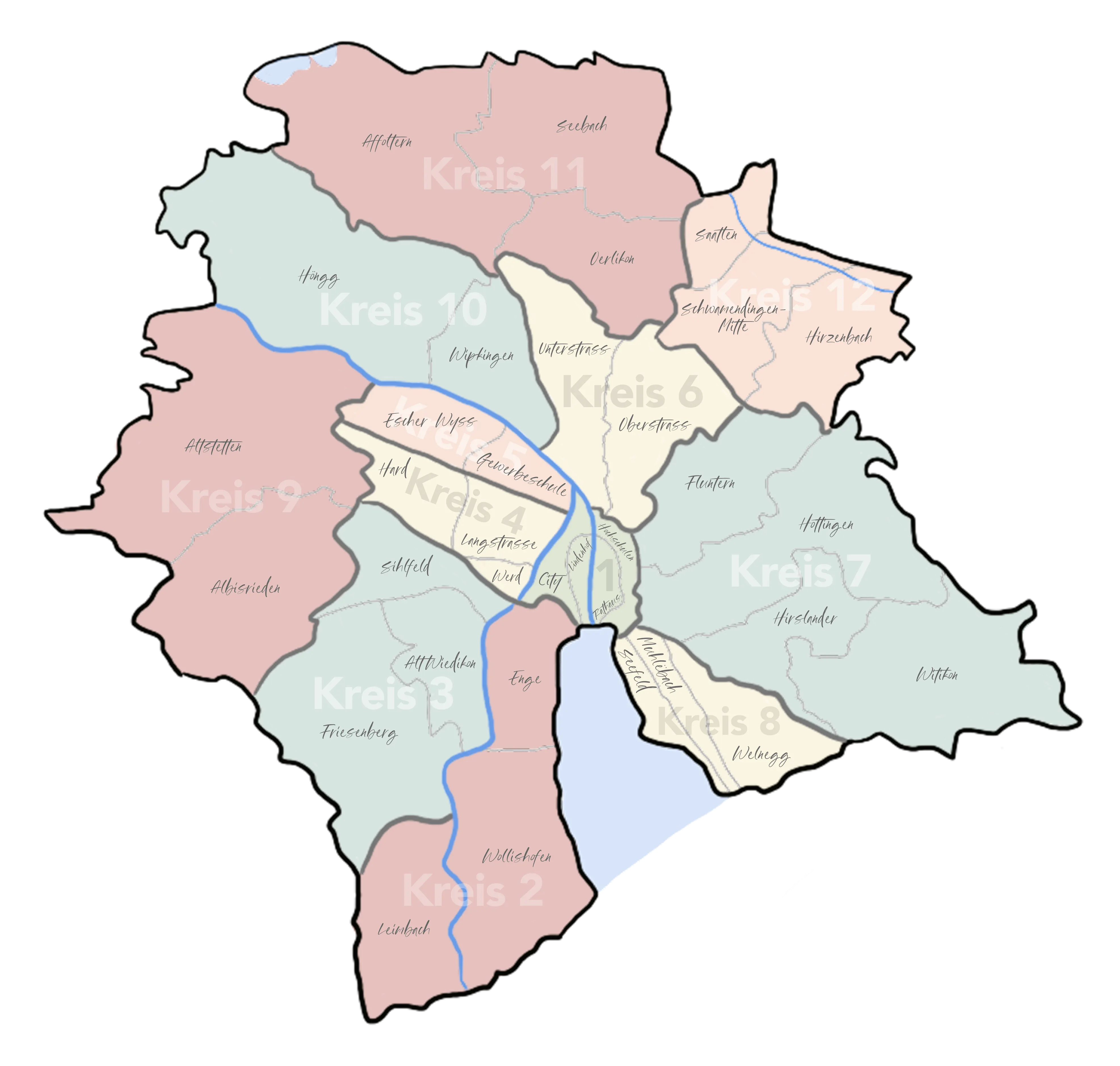 Zurich is split into 12 districts, called Kreis. Together they form “Zone 110” in the transport map. Each has its own flavor, quirks, and stereotypes.